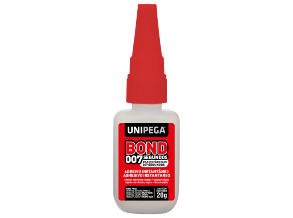 Bond 007 Segundos es un adhesivo instantáneo a base de cianoacrilato multi[1]pegamento, ya que se adhiere perfectamente y de forma instantánea a la mayoría de los materiales porosos y no porosos como gomas, metales, plásticos, porcelana, madera, lona, cuero y una infinidad de sustratos. Con una adhesión rápida y fuerte, es fácil de aplicar y con excelente acabado (debido a su transparencia y adhesión instantánea).