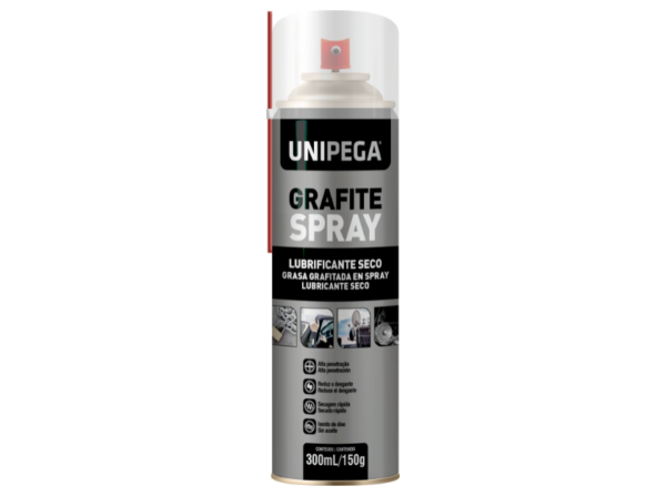 Grasa grafitada spray Unipega actúa como lubricante en seco en mecanismos en general, formando una película protectora. Resiste a la alta temperatura y esfuerzos mecánicos, con acción duradera y alto poder de penetración. Por ser spray, alcanza áreas de difícil acceso. Exento de aceite. Indicado para roscas expuestas, canales de vidrio, antenas, rieles, portones, cerraduras, candados, cadenas, máquinas, equipos industriales y domésticos.