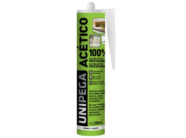 Sellador de silicona monocomponente de curado acetico indicado para el sellado de aluminio, vidrio, azulejo, cerámica, sanitarios y box de baños. Resistente a la formación de hongos. Con propiedades de no escurrimiento, cura con la humedad ambiente, formando un caucho flexible y durable.