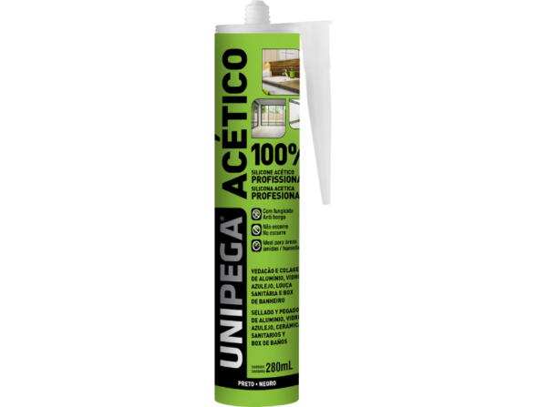 Sellador de silicona monocomponente de curado acetico indicado para el sellado de aluminio, vidrio, azulejo, cerámica, sanitarios y box de baños. Resistente a la formación de hongos. Con propiedades de no escurrimiento, cura con la humedad ambiente, formando un caucho flexible y durable.
