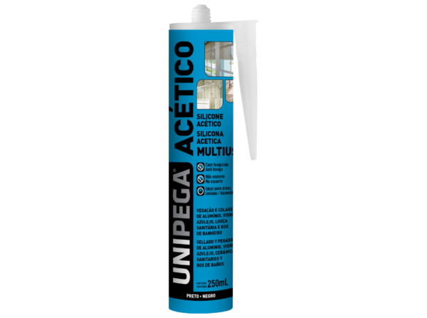 Sellador de silicona monocomponente de curado acetico indicado para el sellado de aluminio, vidrio, azulejo, cerámica, sanitarios y box de baños. Resistente a la formación de hongos. Con propiedades de no escurrimiento, cura con la humedad ambiente, formando un caucho flexible y durable.